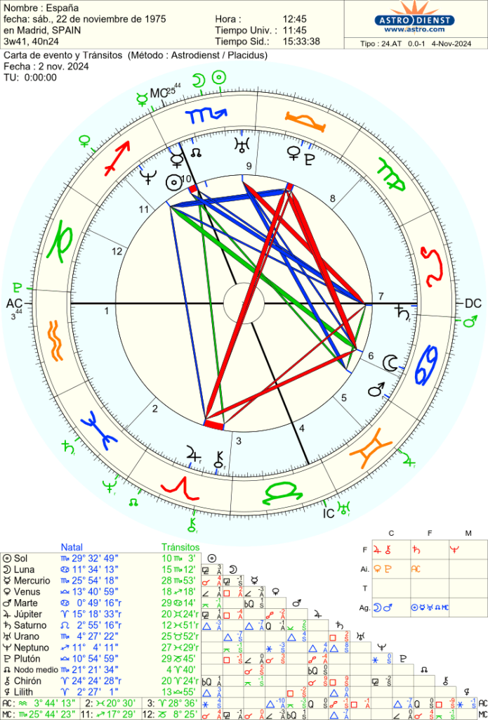 Este es un momento crítico para España, marcado por la necesidad de reconciliar y redefinir sus estructuras políticas y sociales. Los tránsitos actuales resaltan un proceso de transformación profundo, en el que la estructura y el sistema de valores nacionales deben adaptarse a los desafíos y oportunidades del presente. Con Urano como regente, España tiene el potencial para encontrar soluciones innovadoras a sus retos actuales, orientándose hacia un desarrollo más justo y cohesivo que refleje su renovada identidad y propósito en el mundo.