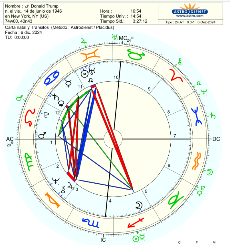 Esta interpretación astrológica ha sido realizada por la empresa Astroflow, especializada en estos contenidos y es parcialmente automática. Para ello se le han aportado a la aplicación: 1. Los datos natales y 2. La posición de los planetas en la actualidad y en los próximos meses. Se le ha pedido a la aplicación que elabore un informe sobre esta persona y las previsiones vitales en función de los ángulos calculados. La única aportación subjetiva por parte de quien ha realizado la introducción de los datos ha sido que se trata de un político estadounidense. La mayoría de las valoraciones son automáticas y proporcionadas por la máquina.
