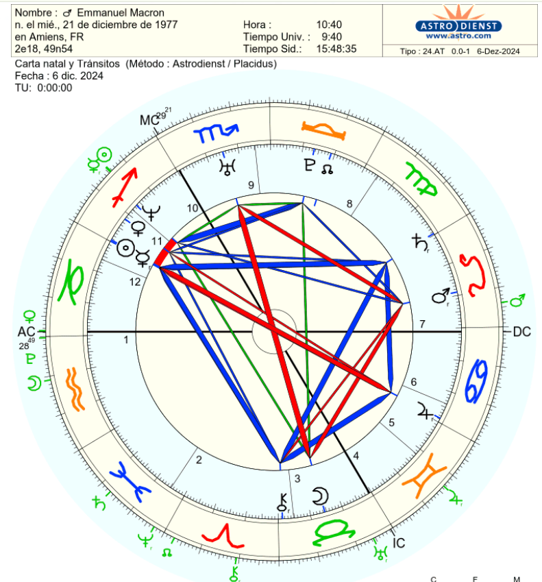 Esta interpretación astrológica ha sido realizada por la empresa Astroflow, especializada en estos contenidos y es parcialmente automática. Para ello se le han aportado a la aplicación: 1. Los datos natales y 2. La posición de los planetas en la actualidad y en los próximos meses. Se le ha pedido a la aplicación que elabore un informe sobre esta persona y las previsiones vitales en función de los ángulos calculados. La única aportación subjetiva por parte de quien ha realizado la introducción de los datos ha sido decirle que era el presidente de Francia. La mayoría de las valoraciones son automáticas y proporcionadas por la máquina.