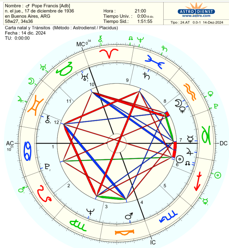 Situada aquí, la Luna indica que tus relaciones públicas y personales son el vehículo de tu mensaje. Este Papa ha buscado ser el «pastor universal», pero esta posición también pone en riesgo la estabilidad de las alianzas, especialmente cuando Plutón y Marte activan la Casa 7, forzando rupturas o traiciones.Aspectos Natales: