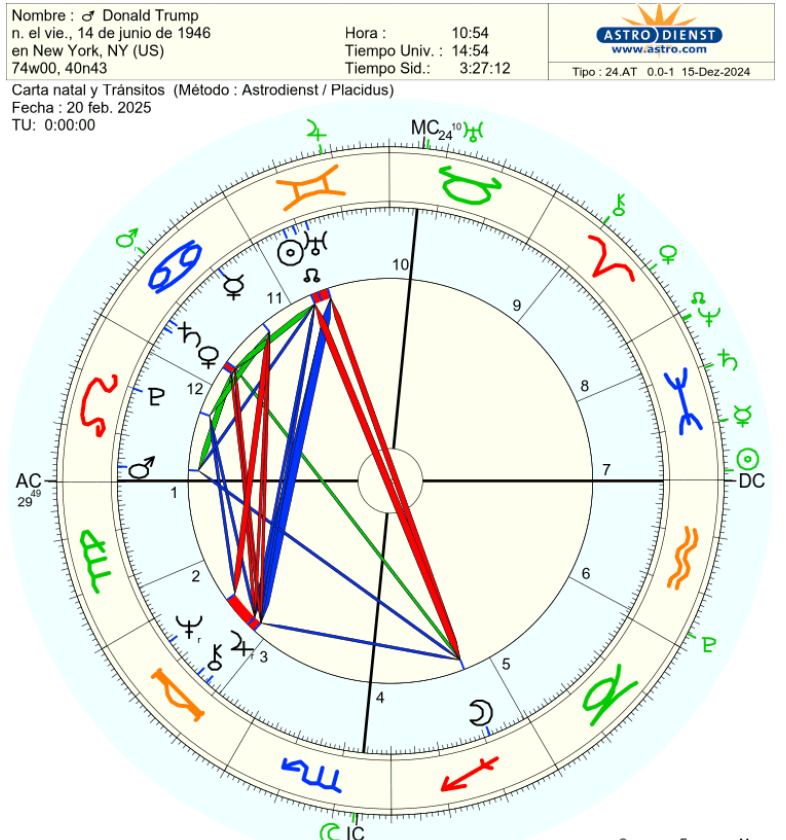 Hemos visto en otro informe por qué Trump ha ganado las elecciones este año 2024. El tránsito de Urano sobre su Medio Cielo, apoyado por un sextil de Saturno sobre el mismo punto y el paso de Júpiter por su casa 10, el Sol y Urano han hecho imposible que perdiera los comicios.