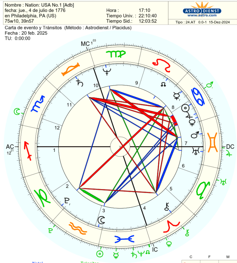 La carta natal de Estados Unidos (4 de julio de 1776) tiene como tránsito principal, para ese mismo día, a marte sobre el Sol (la autoridad máxima de un país) confirmándonos que, en efecto, ese día habrá algo importante de índole violento. Casualmente, también, en la cúspide de la casa 8 (la muerte). Saturno hace cuadratura al marte natal, siendo Saturno regente de la casa 2 (poderes económicos). Urano hace un aspecto de 45º al sol de la carta.