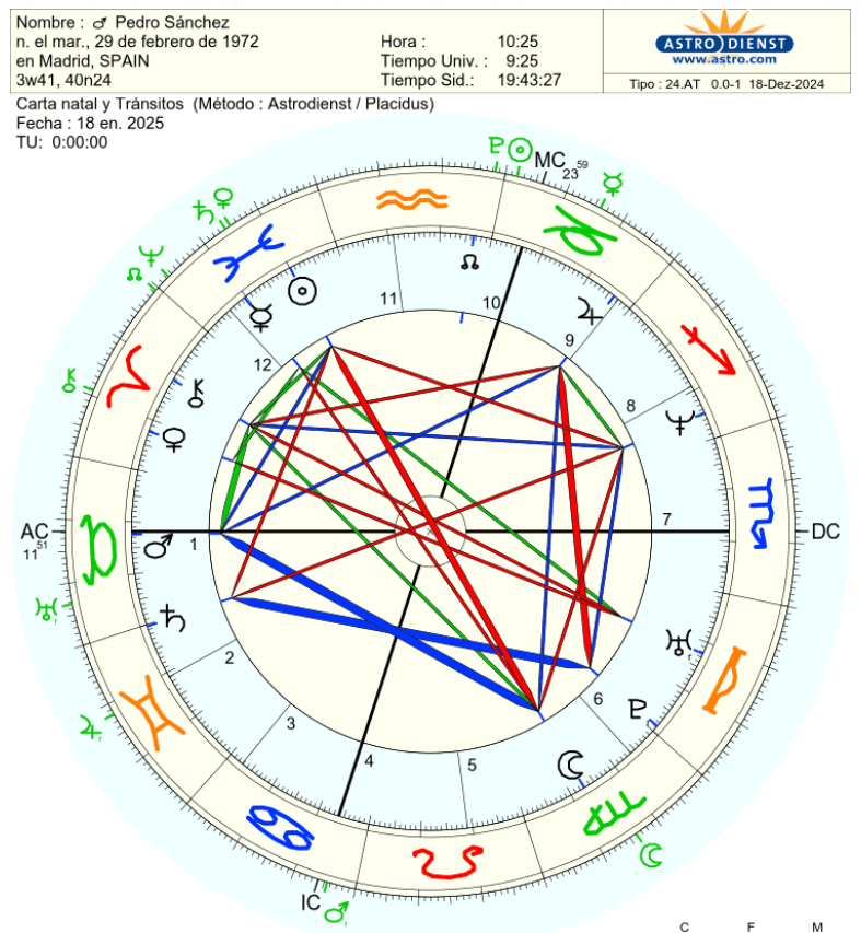 Entre los días 18 y 22 de enero de 2025, Marte retrógrado, el planeta de la guerra, el conflicto y las acciones directas, transitará lentamente sobre el Fondo del Cielo (Casa 4) de Pedro Sánchez, formando una oposición exacta al Medio Cielo (Casa 10), el símbolo de su carrera y posición de poder. Este tránsito es como una tormenta perfecta: no solo refleja un ataque implacable a los cimientos de su vida política, sino que apunta a la desintegración de su imagen pública y la exposición de secretos cuidadosamente guardados.
