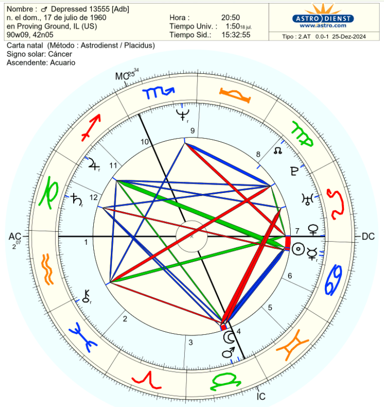 En esta carta natal, hay varios factores que podrían indicar una predisposición a la depresión o, al menos, una tendencia hacia la introspección profunda, los desafíos emocionales y la lucha con el sentido de identidad y propósito. A continuación, se destacan estos factores clave: