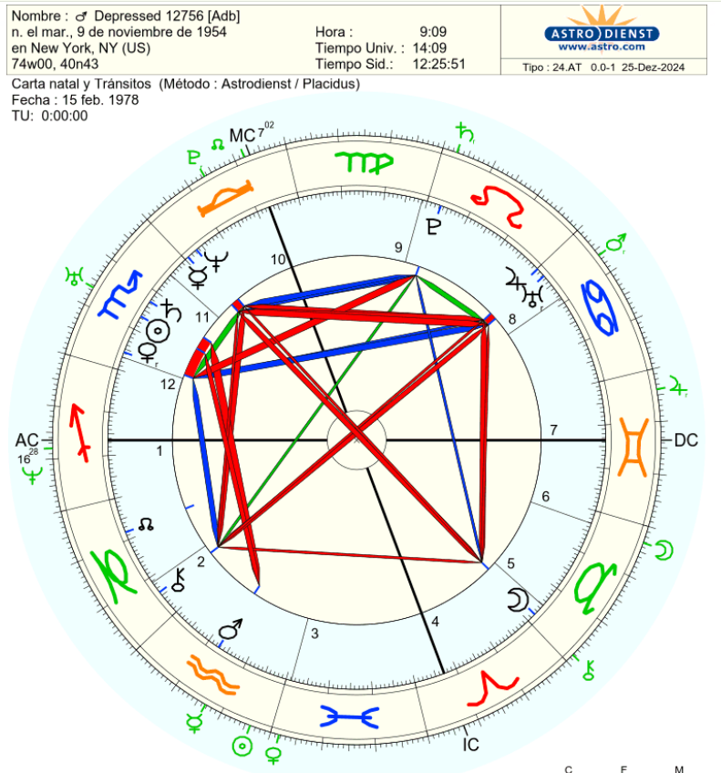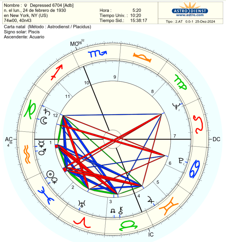En la carta natal, algunos factores astrológicos pueden indicar una mayor sensibilidad emocional, predisposición a períodos de introspección profunda o vulnerabilidad psicológica. En este caso específico, hay varias configuraciones y aspectos que podrían señalar una proclividad hacia la depresión: