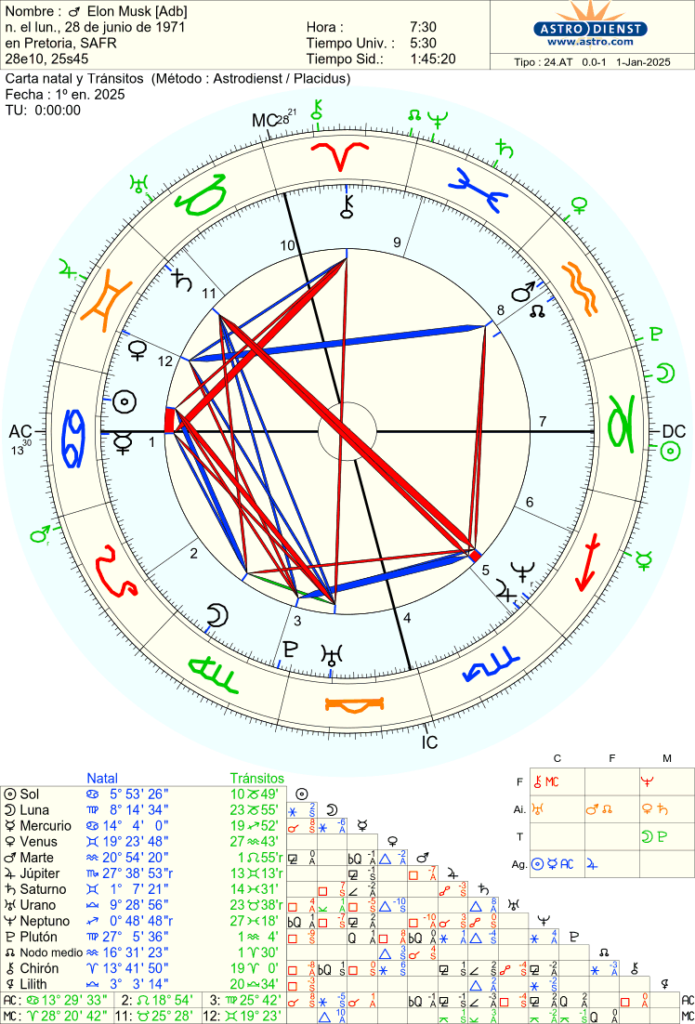 El tránsito de Marte en cuadratura al meridiano, combinado con la semicuadratura de Urano al Sol y Mercurio-Ascendente, sitúa a Elon Musk en un momento crítico de su vida. Estas influencias no solo exacerban las tensiones entre su vida pública y privada, sino que también lo desafían a redefinir su rol como líder visionario frente a un entorno de resistencia y transformación. Este período marca un punto de inflexión en su legado, donde la presión externa y las dinámicas internas determinarán si sus innovaciones y decisiones estratégicas solidifican su imperio o lo empujan hacia una necesaria reinvención personal y profesional.
