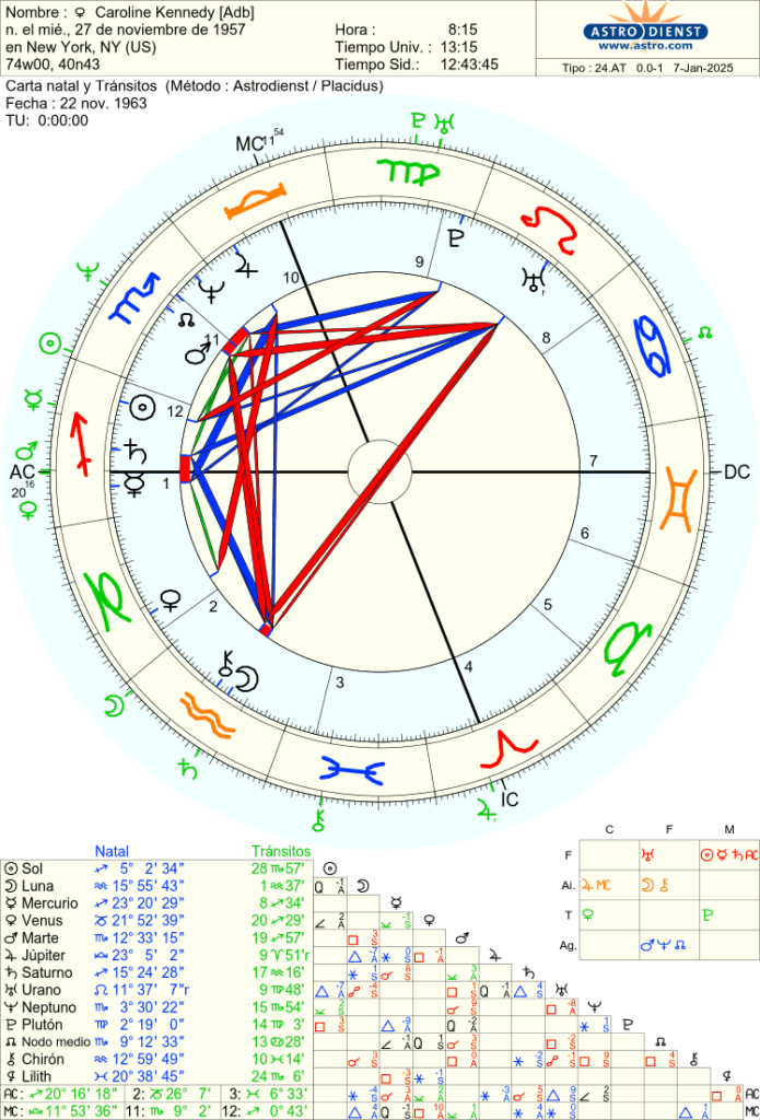 Uno de los tránsitos más destacados es el de Marte por el Ascendente (ASC) de su hija Caroline. Este tránsito es significativo porque Marte representa la energía, la acción y la asertividad. Cuando Marte transita por el Ascendente, puede indicar un período en el que la persona se siente impulsada a tomar la iniciativa y a afirmarse en su entorno. En el contexto del trágico evento del asesinato de su padre, este tránsito podría reflejar la intensa energía y las emociones que Caroline experimentó en ese momento crítico de su vida.