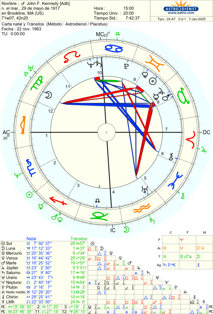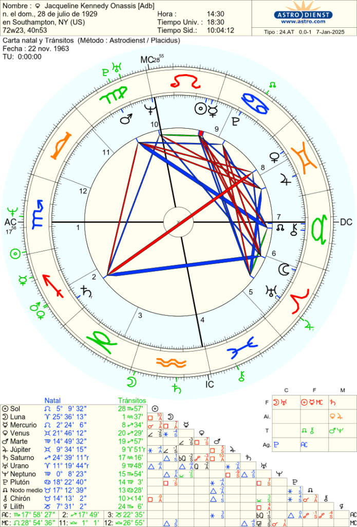 Además, los tránsitos de JFK y Jacqueline también son relevantes, ya que reflejan las tensiones y desafíos que enfrentaron en ese día fatídico. Los tránsitos planetarios en sus cartas pueden ofrecer una visión de las circunstancias que rodearon el asesinato y cómo estas influencias astrológicas pudieron haber impactado sus vidas y decisiones.
