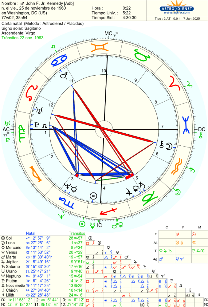 En las cartas siguientes se pueden ver los tránsitos de John F. Kennedy, su mujer Jacqueline Kennedy y sus hijos, Caroline y John F. Kennedy Jr. En todos se observan tránsitos importantes para el día del asesinato del presidente, el 22 de noviembre de 1963.
