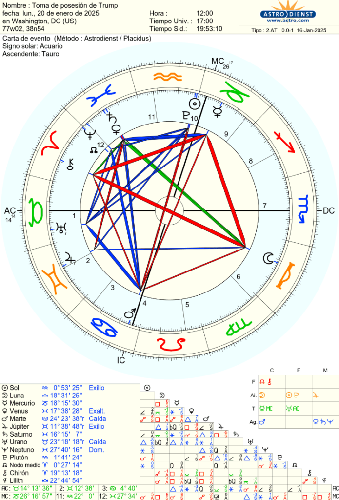 Como he dicho antes, la fuerte presencia de Plutón en el Medio Cielo, en su rol como regente de la Casa 7 (relaciones y alianzas), sugiere que la política exterior será transformadora y posiblemente conflictiva. El mandato de Trump estará marcado por intentos de redefinir las relaciones internacionales, con un énfasis en el poder y la influencia. Este aspecto puede indicar procesos de cambio profundo en cómo se manejarán las alianzas y acuerdos internacionales, recalibrando las dinámicas de poder en el escenario global.