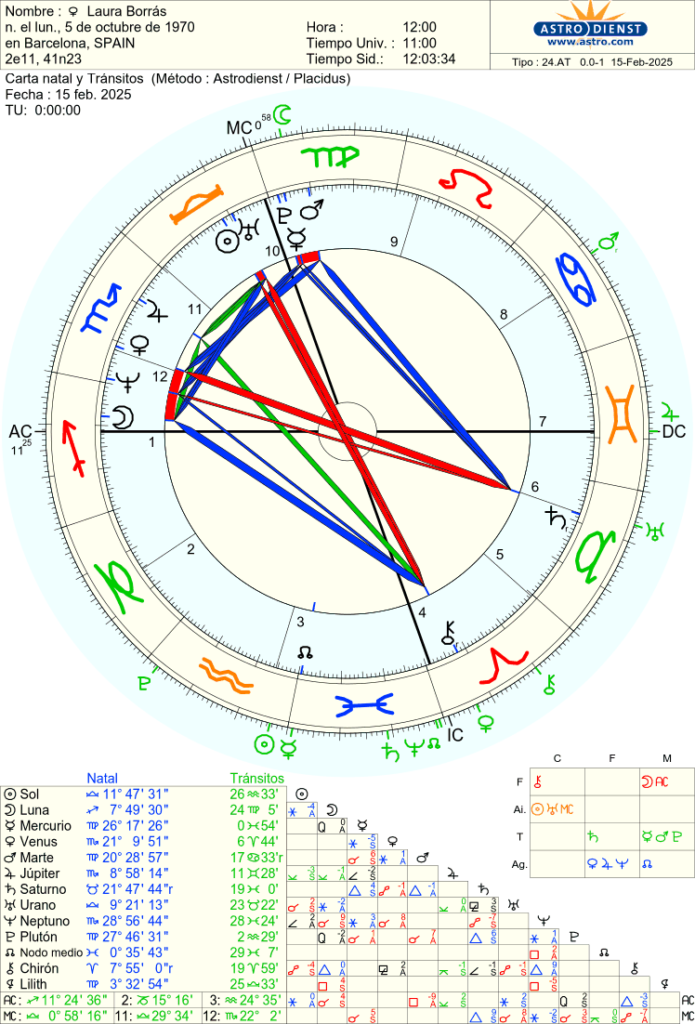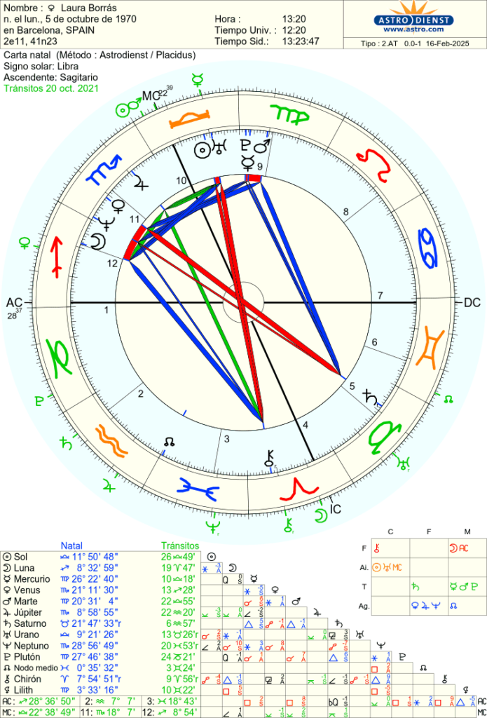Ya tenemos situados los planetas, por aproximación de «vida» es decir por coincidencia de los hechos biográficos. Ahora vamos a comprobar los tránsitos importantes en la vida de Laura Borràs. Empezaremos con aquellos para los que tenemos fechas comprabadas, que no son demasiados.