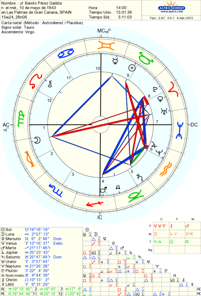 - Saturno en casa 5 y casi en la cúspide de la casa 6, es una posición muy común entre los escritores. Véase la carta natal de Benito Pérez Galdós en la siguiente imagen, con Saturno en la casa 5.