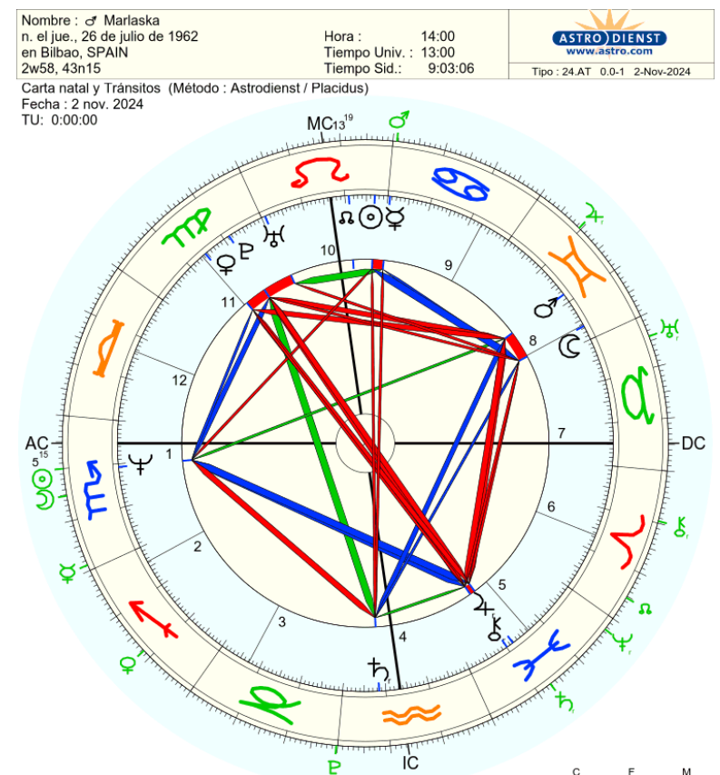 Esta interpretación astrológica ha sido realizada por la empresa Astroflow, especializada en estos contenidos y es parcialmente automática. Para ello se le han aportado a la aplicación: 1. Los datos natales y 2. La posición de los planetas en la actualidad y en los próximos meses. Se le ha pedido a la aplicación que elabore un informe sobre esta persona y las previsiones vitales en función de los ángulos calculados. No ha habido ninguna aportación subjetiva por parte de quien ha realizado la introducción de los datos. La mayoría de las valoraciones son automáticas y proporcionadas por la máquina.