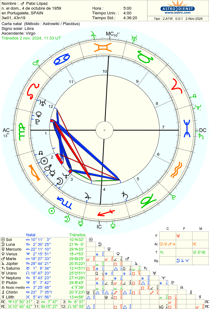 Esta interpretación astrológica ha sido realizada por la empresa Astroflow, especializada en estos contenidos y es parcialmente automática. Para ello se le han aportado a la aplicación: 1. Los datos natales y 2. La posición de los planetas en la actualidad y en los próximos meses. Se le ha pedido a la aplicación que elabore un informe sobre esta persona y las previsiones vitales en función de los ángulos calculados. No ha habido ninguna aportación subjetiva por parte de quien ha realizado la introducción de los datos. La mayoría de las valoraciones son automáticas y proporcionadas por la máquina.