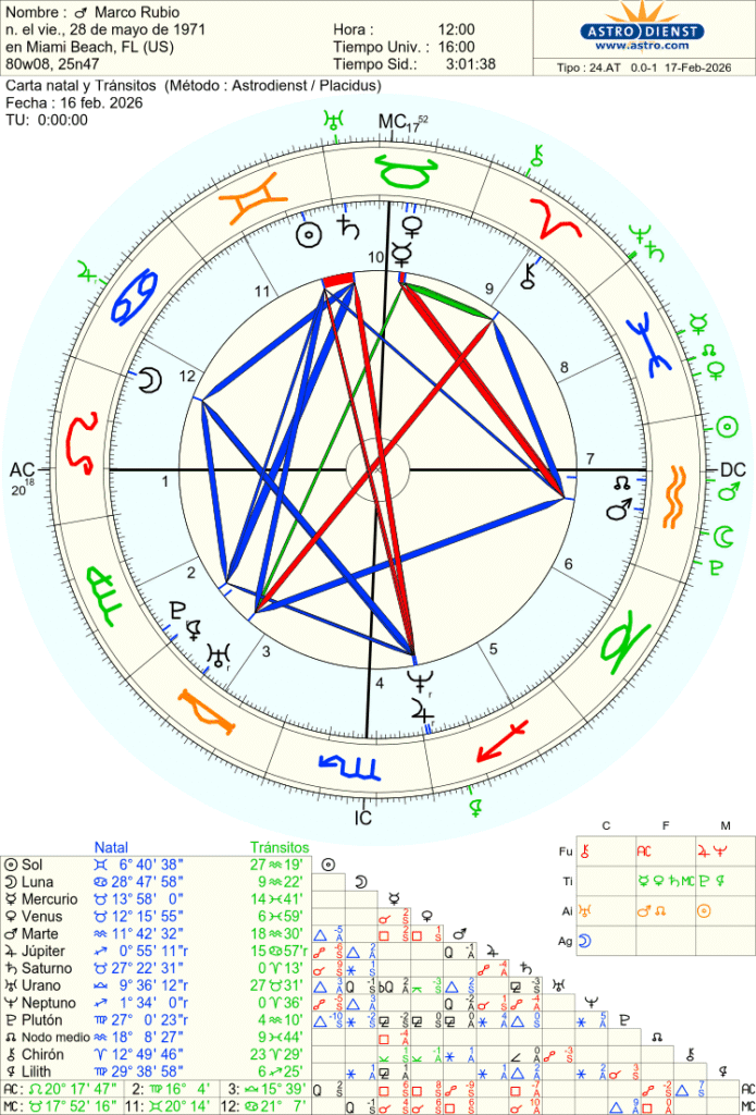 Vamos a analizar la carta natal de Marco Rubio, Secretario de Estado de EEUU. La hora 12:00 que aparece en la carta es una hora “ficticia” o técnica que se usa cuando el dato real no está disponible y además es un personaje público. Eso significa que el Ascendente, las casas y la posición exacta de la Luna (que se mueve unos 12 grados por día) pueden no ser fiables. Lo más sólido de todo el análisis son las posiciones por signo y los aspectos entre planetas lentos.