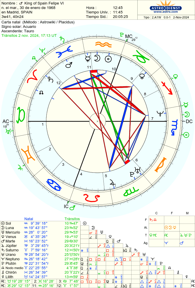 Sin embargo uno de los peores tránsitos actuales es el de Urano que, si bien es cierto que acabará haciendo un trígono al MC del monarca, aportando una reacción original positiva que puede proyectar su figura de forma constructiva, ahora mismo (principios de noviembre de 2024) hace una cuadratura a la Luna natal.