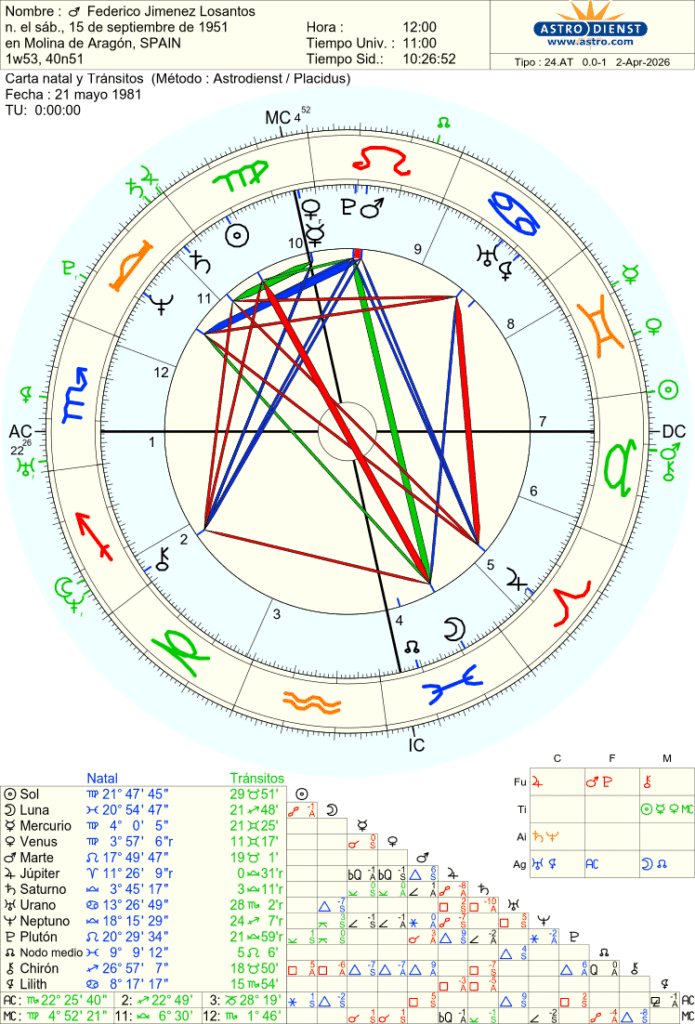 En la actualidad (2 de abril de 2026) vemos que Urano en tránsito hace una nueva cuadratura (pero desde el otro lado, desde la casa 7, casualmente) al MC-FC y eso me indica que algo está a punto de suceder en su vida que le va a hacer cambiar de trabajo (¿jubilación?) y de residencia. No sería raro que esto fuera así, dada la edad de Losantos.
